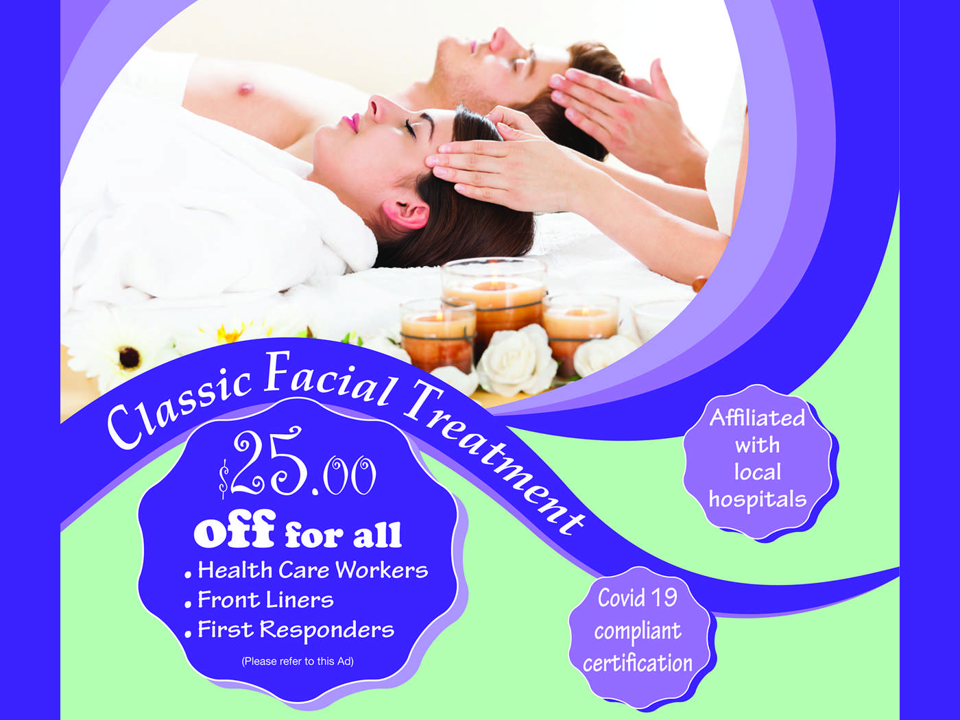 $25.00 off of our Classic Facial Treatment for all Healthcare Workers, Front Liners, and First Responders. (Please refer to this Ad when making your appointment.)